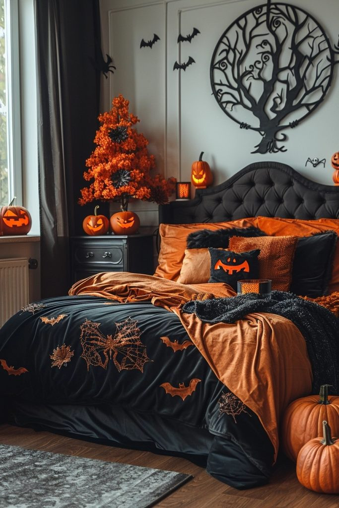 A Harvest Haven bedroom blends deep orange and rich burgundy hues to create a powerful sense of warmth and comfort. The bedding features heavy, soft materials like flannel or wool, perfect for chilly autumn nights. The decorations often include subtle, elegant harvest-themed elements like a beautiful wreath of dried wheat on the door or a small, artistic arrangement of gourds on a dresser. An inviting reading nook with a plush armchair and a pile of seasonal books adds immense charm.
