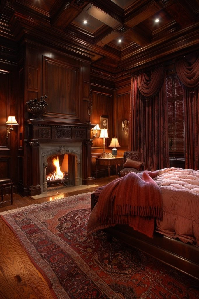 A Fireside Slumber Chamber is a bedroom designed around the primal comfort and warmth of a classic fireplace. The decor features a palette of deep reds, oranges, and browns, reminiscent of a crackling fire. A plush, comfortable armchair placed next to the hearth provides the perfect spot for reading or enjoying a hot drink on a cool evening. The bedding is rich and luxurious, ideal for snuggling up and watching the flames on cold autumn nights.
