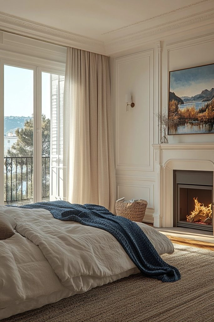 A Breezy Autumn Nights bedroom is designed for those crisp, cool evenings when you want to feel the fresh air. The room features lightweight bedding for easy layering as needed, and an open window setup with sheer curtains that can dance in the breeze. The color scheme is often a deep midnight blue and silver to mimic a clear night sky. A small, elegant electric fireplace or a portable heater provides warmth when the breeze turns chilly.