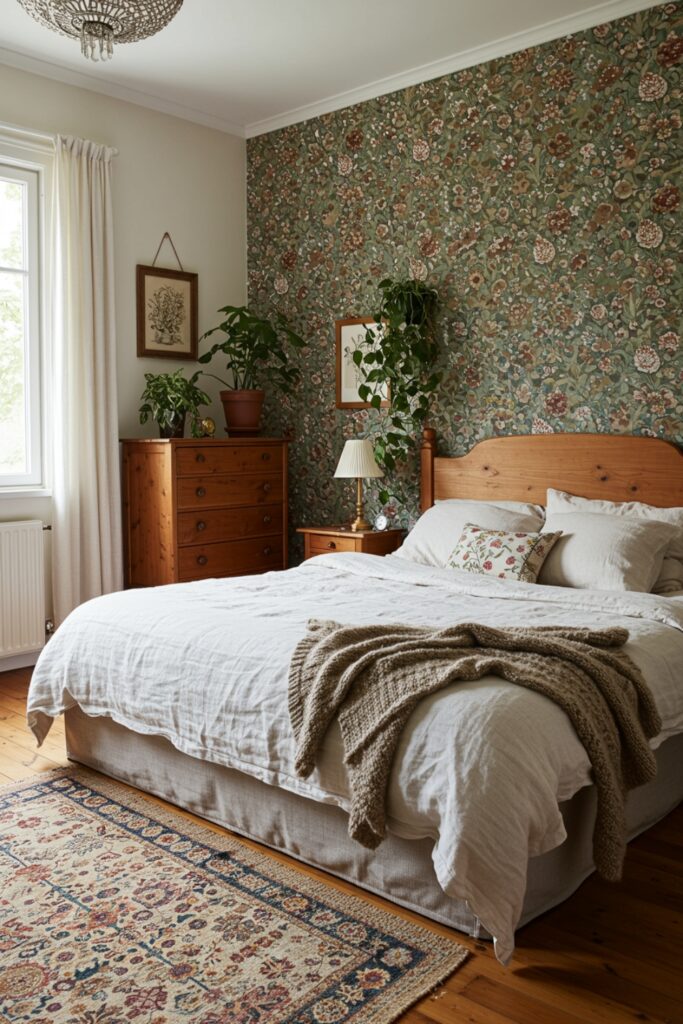 Embrace a style that feels deeply connected to nature by merging granny chic with the popular cottagecore aesthetic. This look is all about romantic, rustic charm. Start with a classic floral wallpaper and layer in an abundance of real houseplants to bring the outdoors in. Furnish the room with simple, sturdy wooden pieces and incorporate natural textiles like linen bedding and a jute rug. The result is a bedroom that feels like a peaceful countryside escape, blending nostalgic patterns with an organic, earthy vibe for a truly comforting and on trend retreat.
