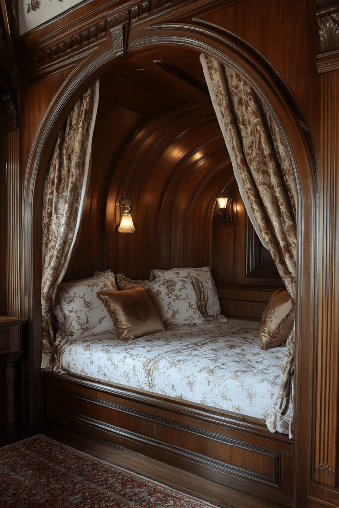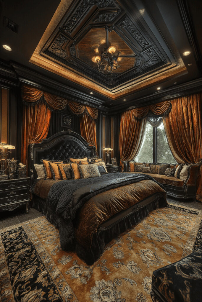 Design an opulent and indulgent escape with a focus on rich colors and sumptuous materials. This luxurious version of granny chic embraces deep jewel tones, lush fabrics like velvet and brocade, and ornate decorative details that create a sense of grandeur. From elegant draperies that pool on the floor to a wealth of plush throw pillows on the bed, every element is chosen to feel luxurious and comfortable. This bedroom is a perfect, pampering retreat from the outside world.