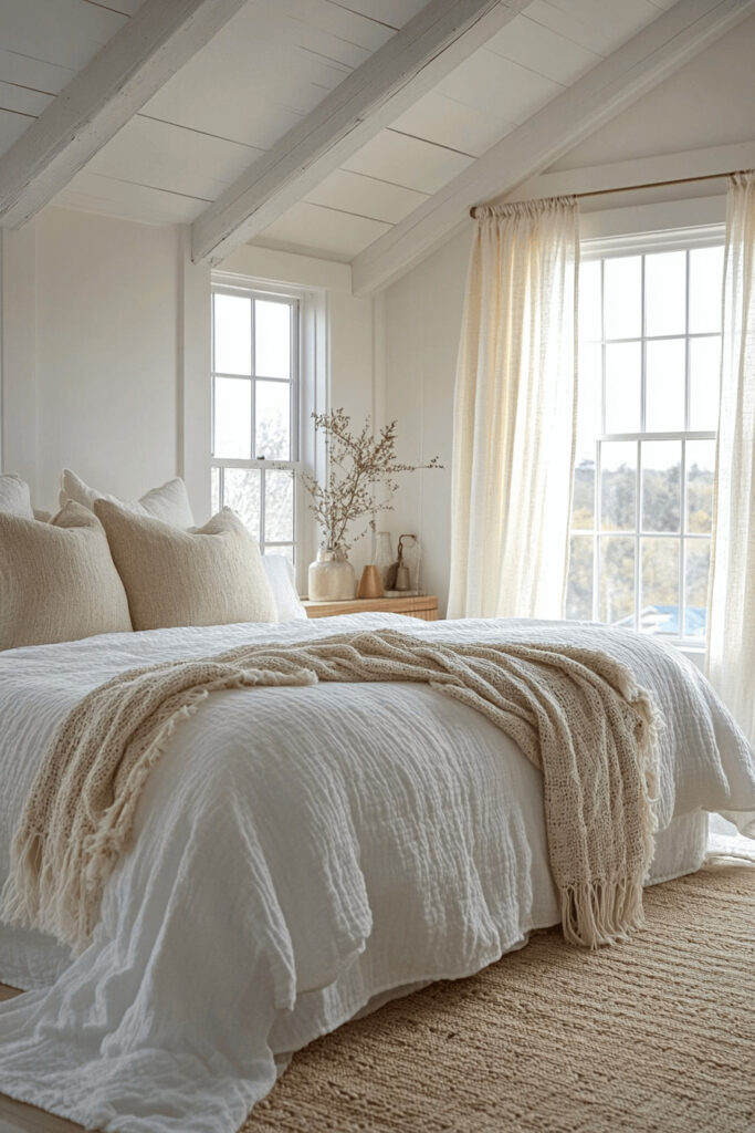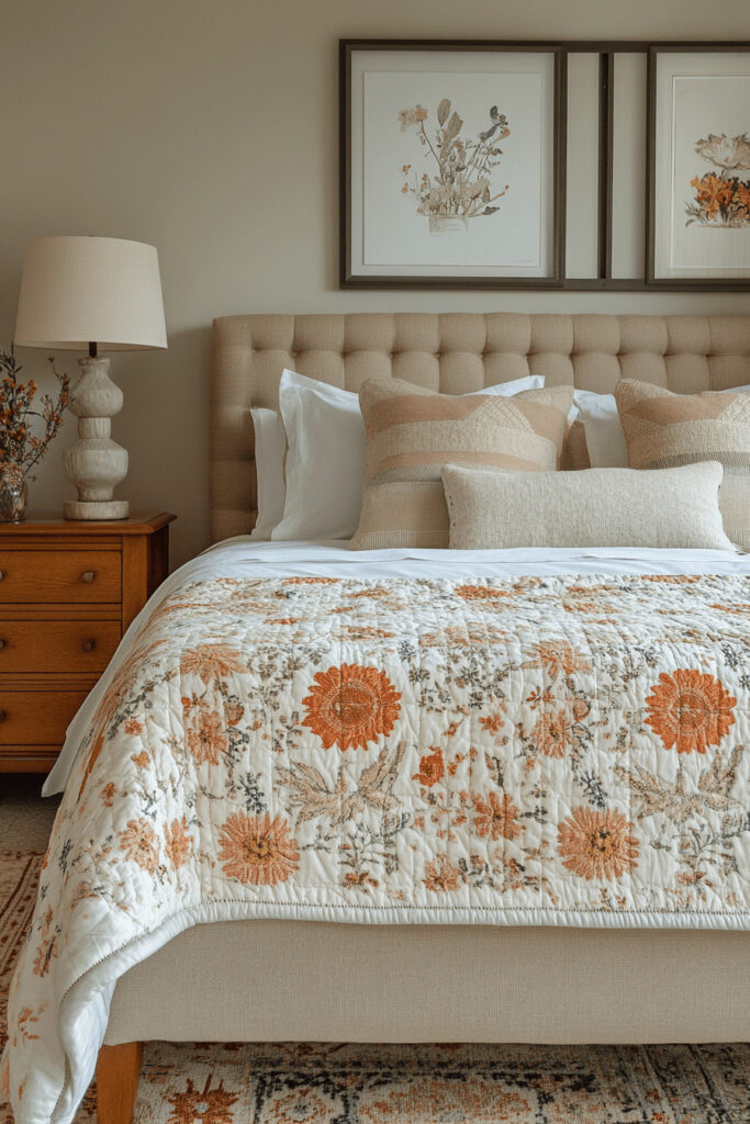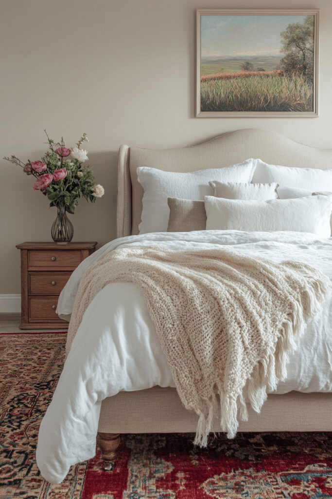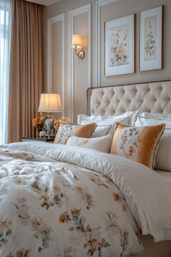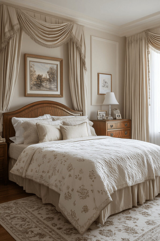 Create a calming and elegant atmosphere with a focus on soft, neutral colors. This version of granny chic uses hues like beige, cream, soft gray, and taupe to form a tranquil and versatile backdrop. To keep the room from feeling flat, interest is added through subtle patterns and a variety of textures in the textiles and accessories. This setting is ideal for anyone who prefers a subtle, sophisticated, and deeply calming bedroom environment.