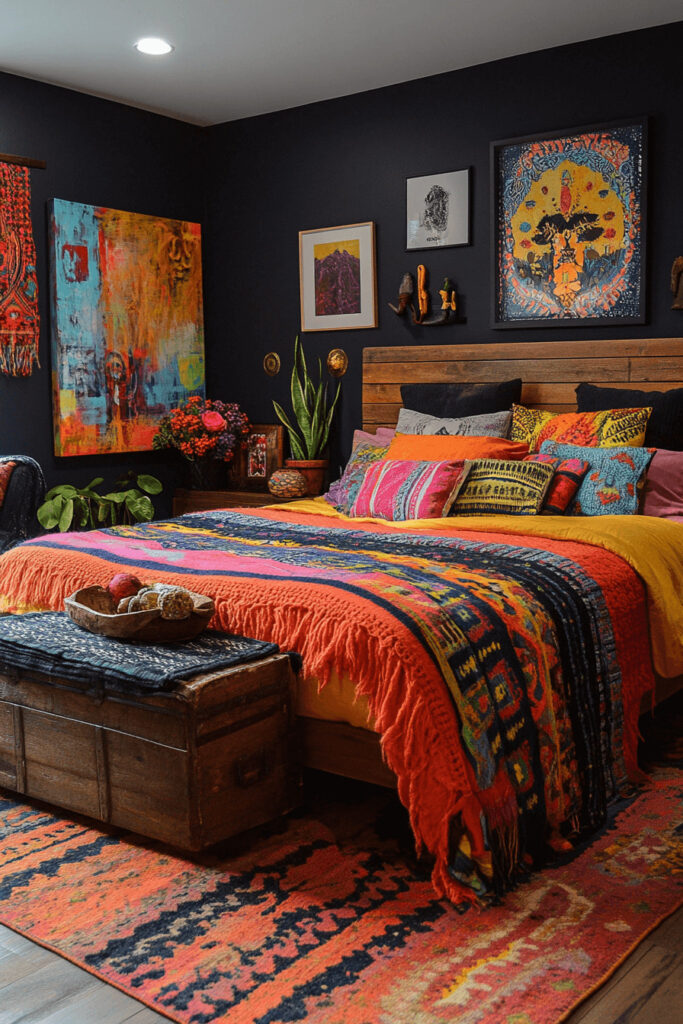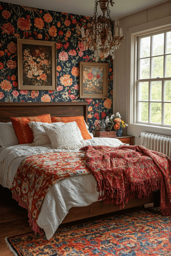 Design a bedroom that is energetic and vibrant, featuring an exciting mix of colors, patterns, and textures. This take on granny chic is all about creating a lively and engaging space through unexpected combinations and bold design choices. A dynamic floral wallpaper might be paired with a geometric rug, for example. Despite its energetic style, the room remains comfortable and inviting with cozy bedding and plenty of plush cushions.