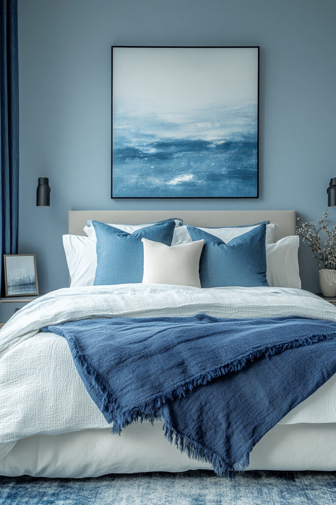 Harness the inherently calming properties of blue to create a serene and restful atmosphere. The Tranquil Blue Serenity Space uses a sophisticated palette of blues, from a pale, misty blue to a deep, enveloping navy. This color is known to promote relaxation, making it perfect for a bedroom. Pairing these hues with soft, natural fabrics like linen and cotton, and gentle, layered lighting, enhances the soothing effect, turning your bedroom into a true sanctuary for rest.