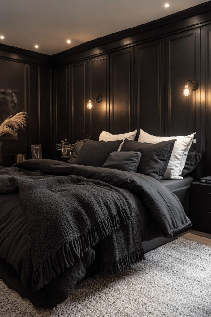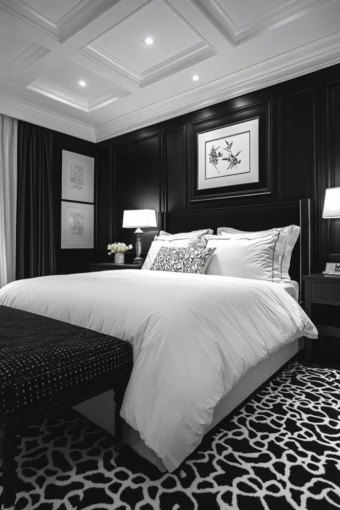 Utilize a classic and eternally chic black and white color palette to create a sophisticated and impactful space. This large bedroom idea emphasizes elegance and high contrast, featuring bold black furniture against crisp white walls, or vice versa. The spacious layout allows for dramatic, large-scale design elements, such as a towering black headboard, striking black-and-white photography, or dramatic white floor-to-ceiling drapes, making the room visually powerful and timelessly stylish.