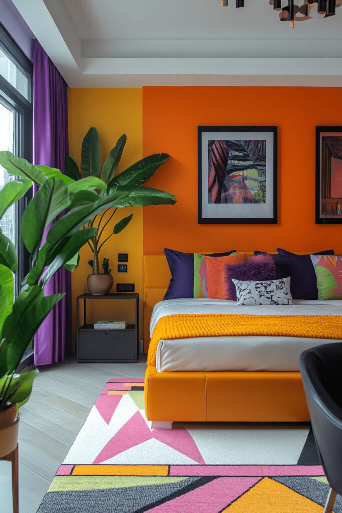 Use bold geometric shapes and vibrant colors to create an energetic and unapologetically modern bedroom. This large bedroom idea takes full advantage of spacious walls and floors to play with large-scale patterns, angular furniture, and sharp, clean lines. Colorful abstract artwork and graphic area rugs enhance the dynamic feel of the room, making it a visually captivating and lively space. This style is ideal for those who love a room with a strong personality, artistic flair, and a contemporary edge.