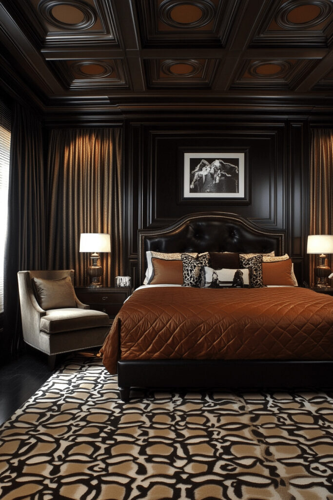 Bring the timeless glamour and geometric elegance of the Art Deco era to a large bedroom setting. This idea incorporates bold geometric patterns, lavish metallic accents in gold or chrome, and luxurious materials like polished marble and dark ebony wood. The grand dimensions of the room are perfect for featuring statement furniture with curved lines and symmetrical, decorative elements that echo the opulence of the 1920s and 1930s. It’s a perfect choice for those who appreciate historical elegance infused with a touch of theatrical drama.