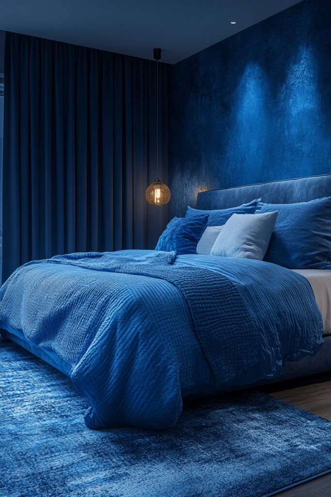 Harness the calming psychological properties of the color blue to create a peaceful and restorative atmosphere in a large bedroom. The Tranquil Blue Serenity Space focuses on a palette of blues, from soft sky blue to deep, calming navy. This is complemented with soft lighting and minimalistic decor to enhance the tranquil vibe. The spacious room allows for a serene, uncluttered layout, with plenty of open space for relaxing and unwinding, making it a perfect oasis from the stresses of daily life.