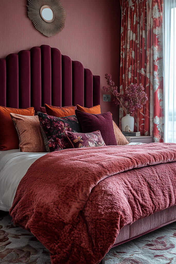 Design a bedroom that envelops you in decadent luxury and profound comfort. The Plush Velvet Dreamscape utilizes lush velvet fabrics for drapes, bedding, and upholstery, adding a sense of deep opulence and tactile warmth to the room. The expansive space of a large bedroom allows for a grand, oversized bed with a velvet headboard and additional seating areas, making it a rich and deeply inviting retreat. Pairing deep, regal colors like emerald green or sapphire blue with velvet enhances the room’s palatial feel.
