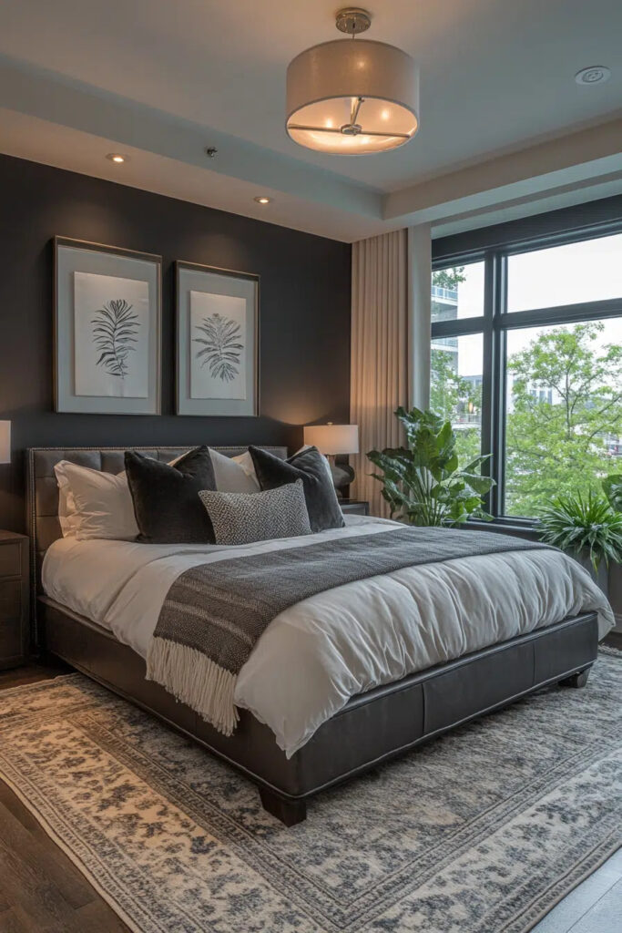 Minimalism in a large bedroom isn’t about emptiness; it’s about the luxury of negative space. A Spacious Minimalist Sanctuary leverages the extra square footage to create a serene, uncluttered, and breathable environment. This design focuses on simplicity, functionality, and impeccable quality over quantity. Use clean lines, a strictly neutral color palette, and only essential, high-quality furniture. Streamlined, built-in storage solutions are key to keeping the room open and airy. This setup is perfect for those who find peace and clarity in a beautifully simple and expansive living space.