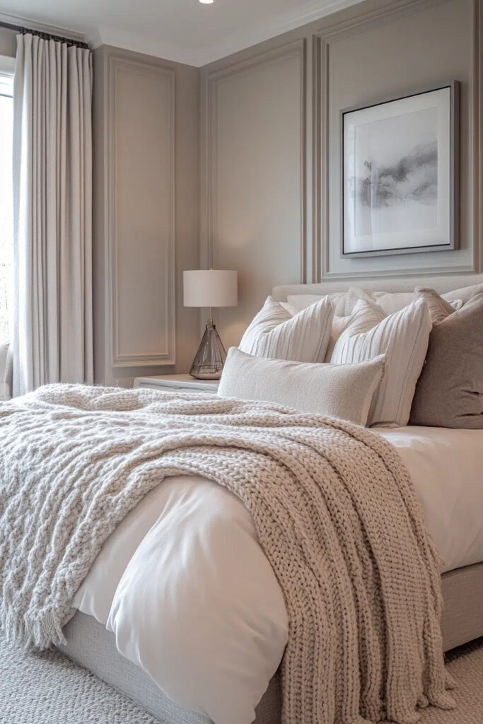 A Serene Neutral Escape emphasizes tranquility and comfort by using a palette of soft, warm neutral tones and thoughtful, minimalistic decor. In this large bedroom idea, the ample space is used to create a fluid and open feel, with furnishings spaced comfortably apart to avoid clutter. Textural elements become key for adding interest without disrupting the calm color scheme; think of a chunky knit throw blanket, a nubby linen armchair, or a soft shag rug. It’s an ideal choice for those seeking a peaceful, sophisticated, and spacious bedroom retreat.