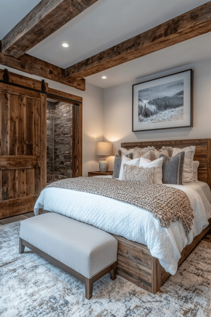 Blend rustic, natural elements with polished, refined design to create a luxurious yet earthy and comfortable space. The Rustic Refined Luxury bedroom uses natural materials like reclaimed wood beams and natural stone accent walls, paired with elegant, often contemporary furniture and sophisticated decor. This creates a beautiful balance between rustic charm and upscale living. The ample space allows for robust, substantial furniture and statement pieces that enhance the rustic theme while maintaining an overall luxurious feel.