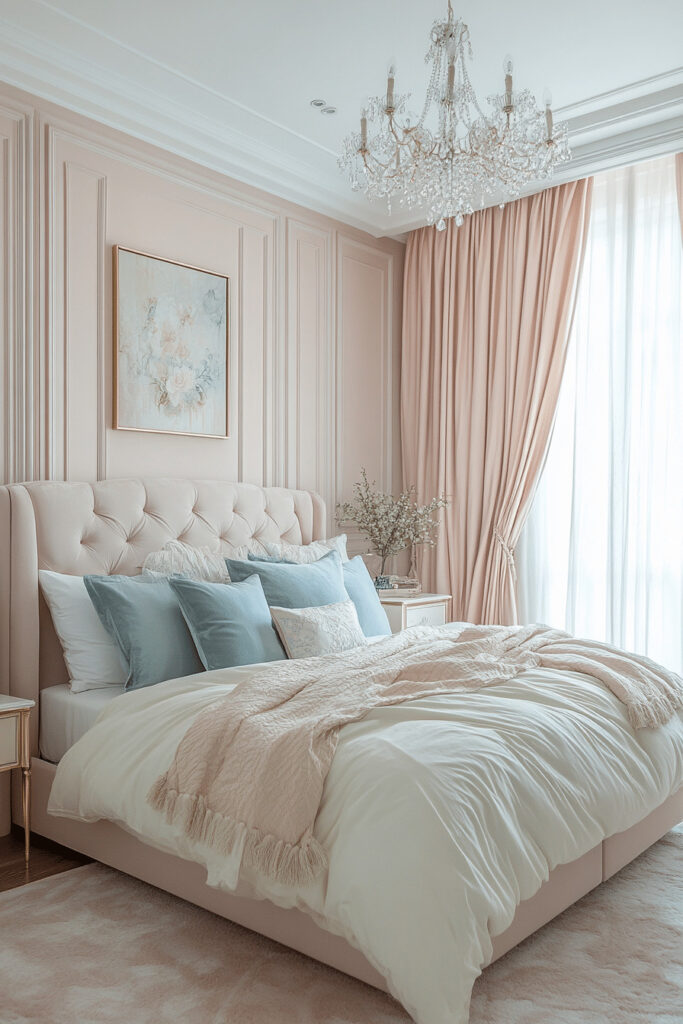 Use a palette of soft, soothing colors to create a light, graceful, and almost ethereal atmosphere in your large bedroom. An Elegant Soft Pastel Palace works beautifully in expansive spaces, where light tones like blush pink, powder blue, or mint green can make the room feel even more open and airy. Luxurious, floor-to-ceiling drapes, delicate crystal or glass lighting fixtures, and soft, high-quality bedding contribute to the gentle elegance. The large area allows for extra seating and decorative pieces, like a chaise lounge or vanity table, that complement the soft, dreamy color scheme.