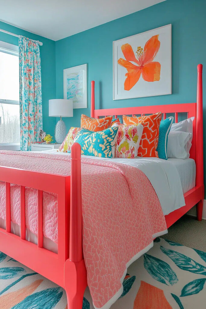 Make a dramatic and confident impact in a spacious bedroom with a Bold Color Block Oasis. This large bedroom idea takes full advantage of extensive wall space to feature large, geometric blocks of vibrant color. This technique can also be used to visually define different zones of the room—a deep blue behind the bed for the sleeping area, and a warm ochre in the lounge space, for example. Bright colors and sharp, clean contrasts create a lively, energetic environment that’s unapologetically stylish and modern, perfect for those who love a vibrant decor style.