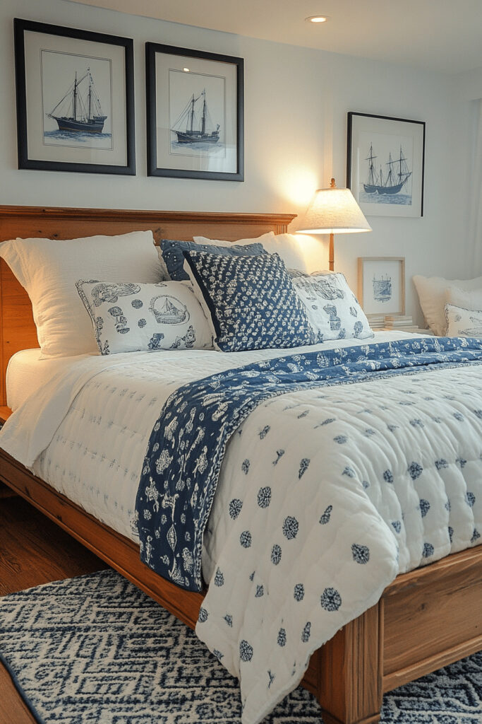 Bring the adventurous spirit and crisp aesthetic of the sea into a spacious bedroom. The Nautical Theme Navigator’s Room uses classic maritime decor, such as antique naval maps, brass fixtures, and ship-inspired furnishings, to create a thematic room that feels both adventurous and refined. The traditional color palette of navy blue and crisp white complements the nautical theme, while the large space allows for impressive thematic elements like a large model ship, a collection of maritime art, or even a telescope pointed towards a window.