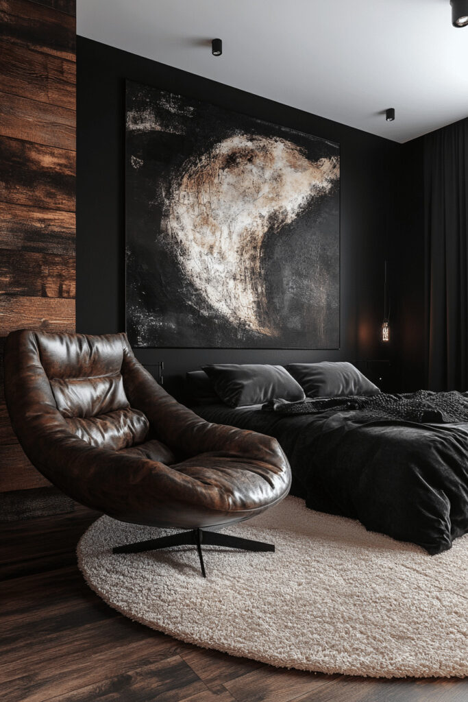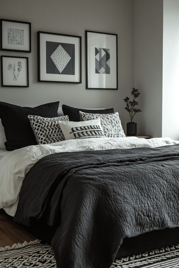 Opt for a minimalist space that plays with the dramatic tension between dark and light elements to create powerful visual interest. This design often uses a deep charcoal or pure black against stark whites to form a striking bedroom environment. Use sleek, contemporary furniture and very few decorative items to keep the look clean and sharp. This approach is perfect for highlighting interesting architectural features like large windows or unusual angles.