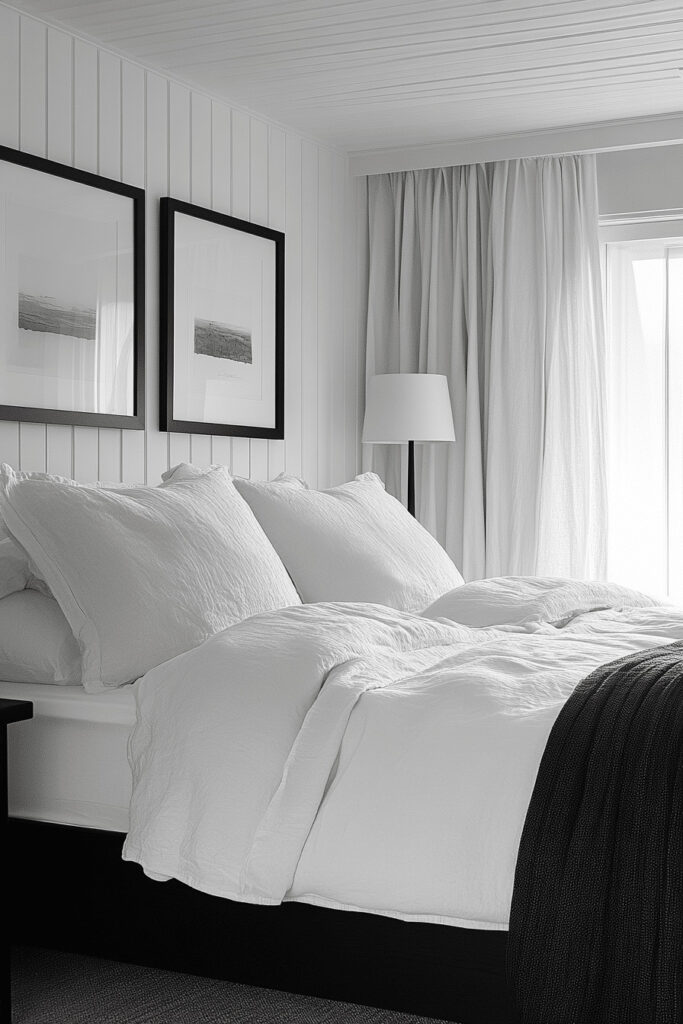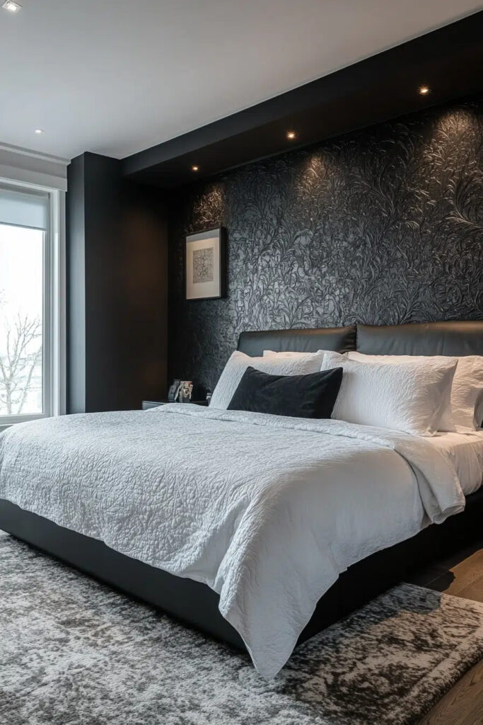 This design uses the timeless power of a black and white color scheme to create a space that is both striking and incredibly simple. Focus on clean lines and uncluttered surfaces to let the bold contrast be the star. Choose streamlined furniture, like a low-profile black bed frame against a crisp white wall. Add depth without clutter by playing with textures, such as a matte black wall finish against a glossy white side table. This is minimalism with a confident, graphic edge.