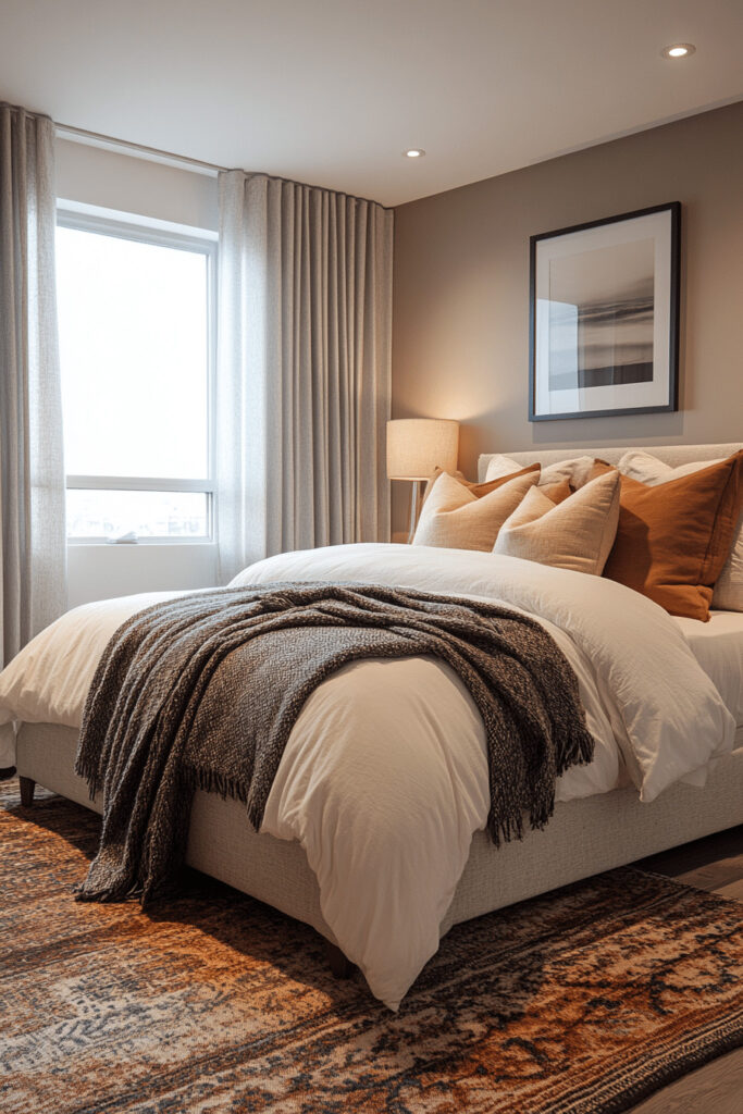 Design a bedroom that utilizes a palette of soft, warm neutrals like beige, ivory, and greige to create an inviting space. This minimalist design emphasizes comfort and calm, using plush textiles like a soft rug and simple, cozy furnishings. Keep the decor unobtrusive and focus on creating a harmonious color palette that soothes the senses. A few handpicked accessories can add subtle elegance without overwhelming the minimalist principle.
