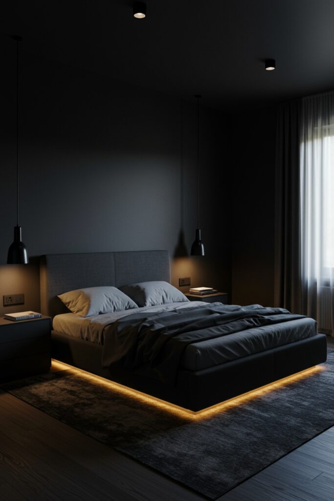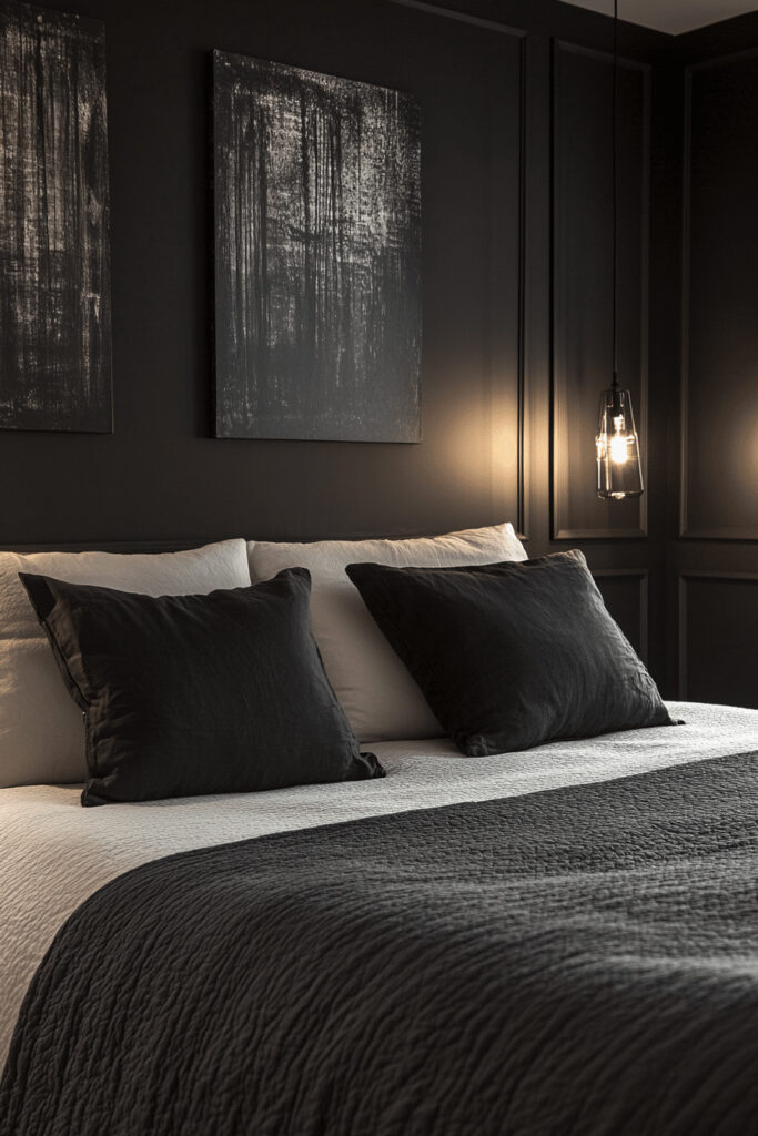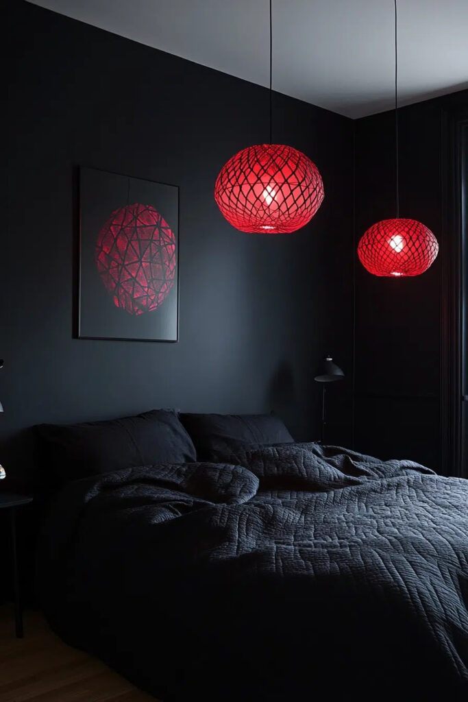 Create a meditative and tranquil bedroom environment with a design inspired by Zen principles. This style often features stark black walls and low-profile furniture that emphasize clean lines and an absence of clutter. The use of minimal decor highlights the beauty of simplicity and elegance. This approach appeals to those seeking a space for deep relaxation, where the dark color fosters a sense of focus and calm. Soft, ambient lighting is crucial for softening the look and making it inviting.