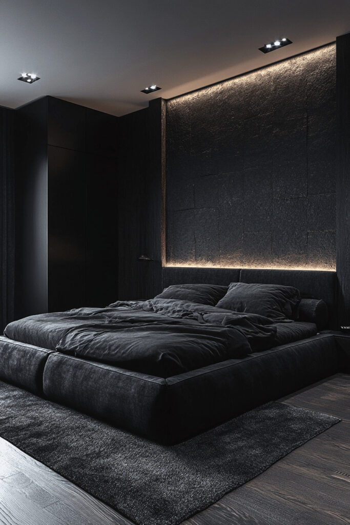 Focus on pure black decor to create a bold, impactful, and artistic bedroom setting that remains uncluttered and sleek. The complete absence of color forces the eye to focus on texture and form, allowing the architectural elements of the room and the shapes of the furniture to stand out. This style is suited for those who appreciate the dramatic flair that pure black can provide. A single monochromatic art piece enhances the aesthetic without adding clutter.
