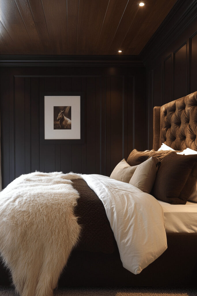 Indulge in the rich, warm tones of dark chocolate to create a cozy, enveloping bedroom atmosphere. The use of wood furniture in dark chocolate shades adds a natural element that softens the minimalist design. This style combines the comfort of warm colors with the clean lines of minimalism, ideal for those seeking a nurturing yet stylish bedroom. Plush textiles in complementary tones like caramel or beige add layers of comfort.