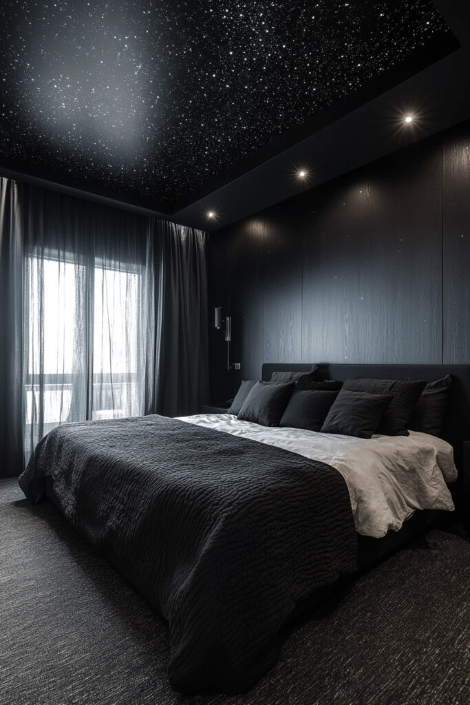Incorporate a celestial theme into a dark, minimalist bedroom by using a deep black palette reminiscent of a clear night sky. Add a magical touch with accents like tiny, twinkling string lights or a subtle star pattern projected onto the ceiling. This style is perfect for creating a dreamy, romantic atmosphere that still adheres to minimalist principles. The use of a few reflective surfaces can mimic the sparkle of distant stars.