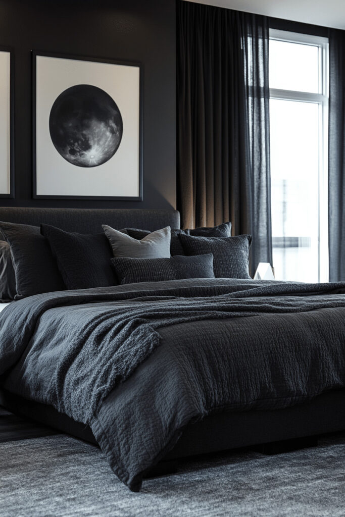 Create a cohesive and deeply tranquil environment with a monochrome palette of deep blacks and varying shades of gray. The absence of bright, jarring colors allows the mind to relax, making it perfect for a restful sanctuary. This design approach focuses on the interplay of different textures to add interest, such as a matte black wall behind a bed with glossy gray bedding. Minimalist art pieces in black and white complete this chic, uniform look.
