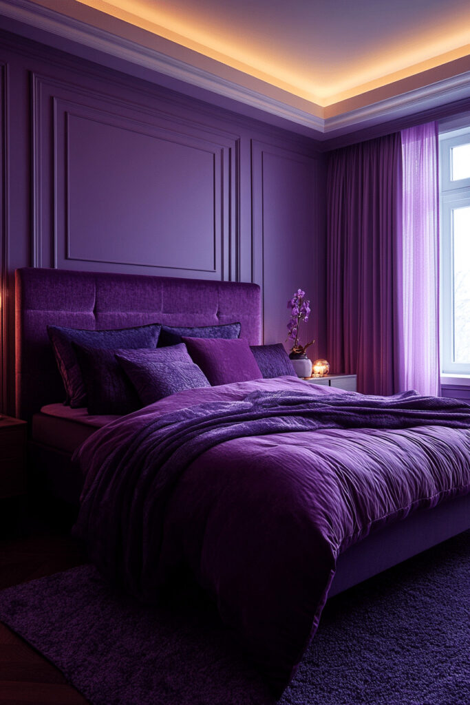 Embrace the luxurious texture of velvet in deep twilight hues like midnight blue or deep plum. This creates a bedroom that is both opulent and minimalist. The plush, soft texture of the velvet is balanced by the simplicity of the furniture and the clean lines of the room’s design. This approach is perfect for infusing a touch of luxury into a minimalist space. Soft, diffused lighting enhances the velvet’s rich texture, making the room feel intimate and inviting.
