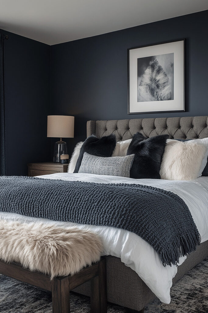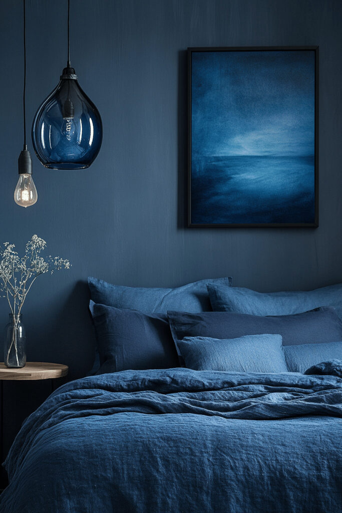 Bring the calming, profound effect of a deep blue sea into your bedroom. Dark navy walls create a sense of tranquility and depth that is both dramatic and soothing. Pair this rich color with lighter shades of blue or soft gray in your bedding for a subtle, elegant contrast. This color scheme is incredibly effective in a minimalist setting, where the focus is on creating an uncluttered space for relaxation. Matte gold or brass accents provide a touch of luxury.