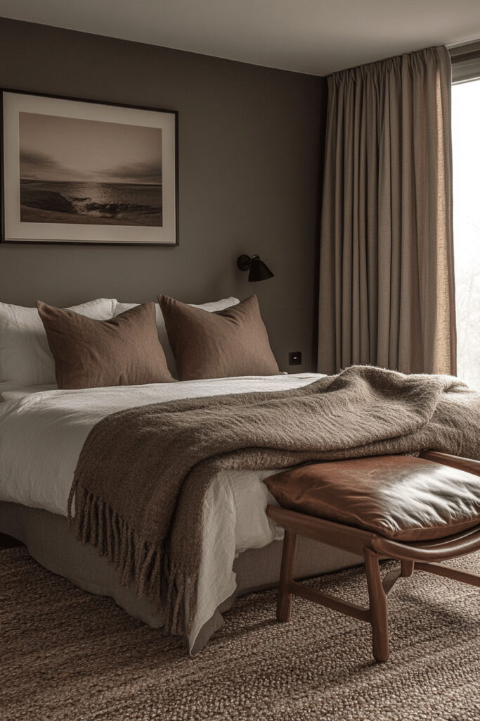 Bring a hint of warmth to a dark minimalist bedroom by using dark taupe. This complex color, which blends gray and brown, pairs beautifully with darker shades for a cohesive and sophisticated look. The understated elegance of taupe is complemented by simple, streamlined furniture that maintains the minimalist vibe. This color scheme is ideal for those who want a dark room that still feels warm and inviting.
