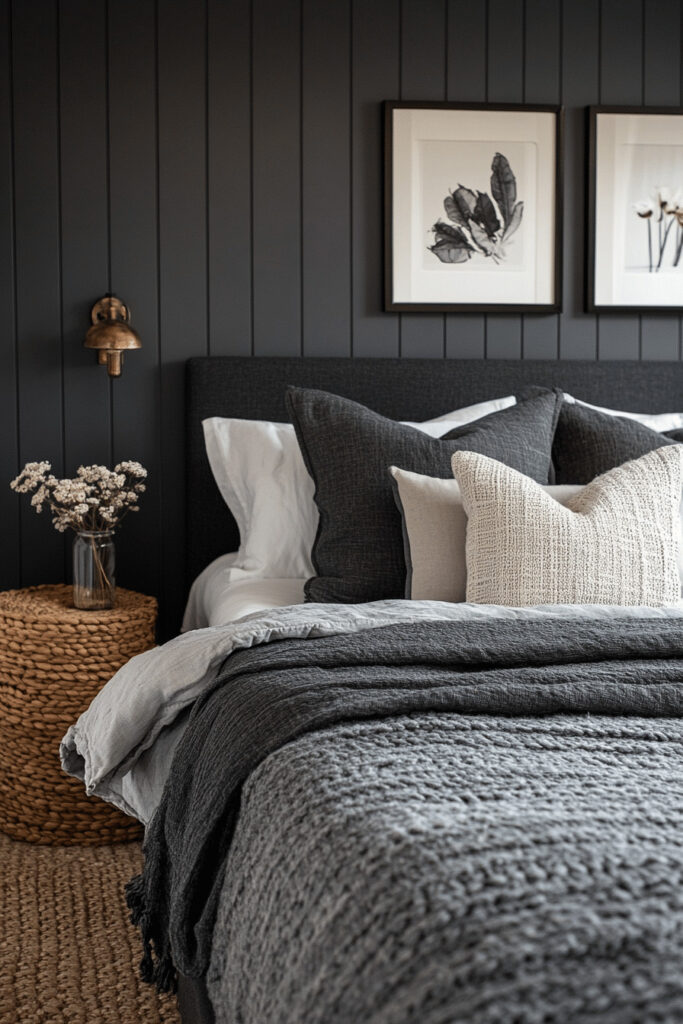 Use various shades of gray, from medium to dark, to create a dynamic yet calming bedroom environment reminiscent of a stormy sky. The monochromatic palette is enriched with different textures, like a soft wool rug or a knitted throw, to add comfort without complicating the minimalist design. This style is perfect for those who seek a neutral, versatile color scheme that supports relaxation and tranquility.
