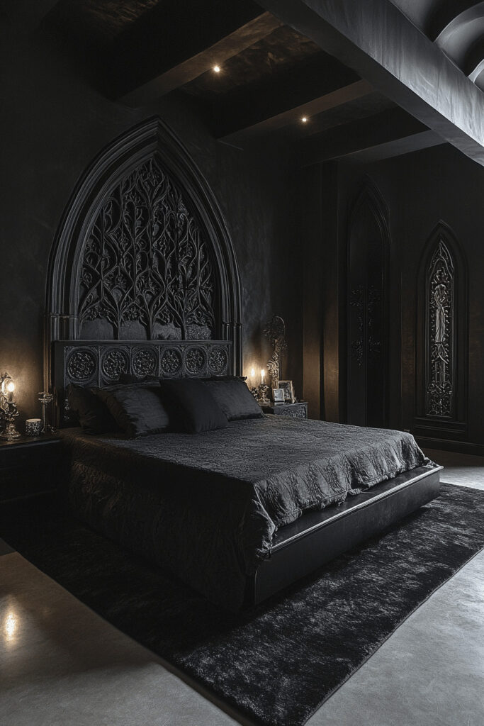 Combine the dramatic flair of gothic design with the sleek simplicity of minimalism. This style uses black as the dominant color, but incorporates a single gothic-inspired element, such as a pointed arch-shaped mirror or a piece of furniture with ornate carvings, painted black. The rest of the room remains strictly minimalist. The result is a sophisticated, slightly edgy bedroom that makes a bold and unique design statement.