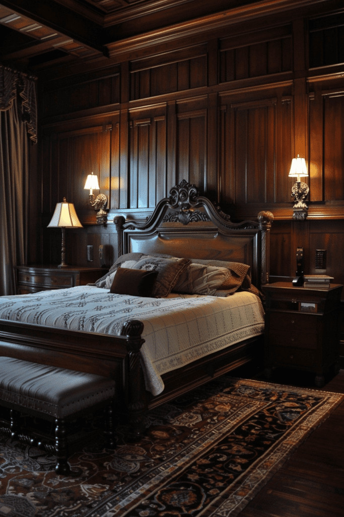 In a room with a dark color palette, rich wood accents can bring a much-needed element of natural warmth and grounding energy. Dark-stained woods like walnut or ebony, or rustic, reclaimed wood with a lot of character, work especially well. A wooden bed frame, nightstands, or even a simple wooden bench at the foot of the bed can add richness and organic texture to a moody bedroom.