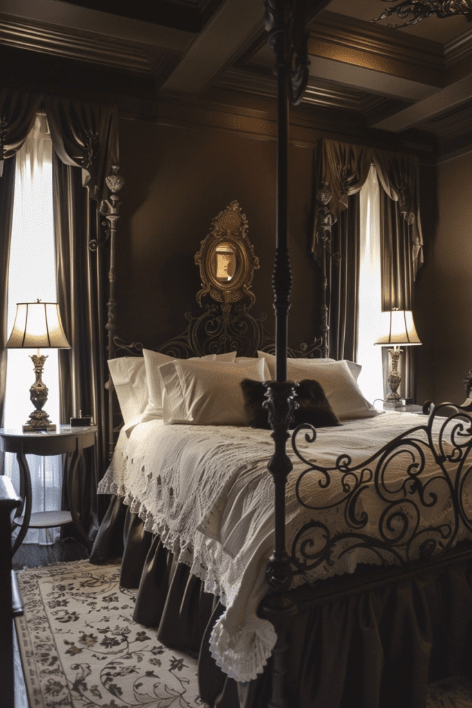 Incorporate a few, carefully chosen Gothic-inspired elements to add a sense of history, drama, and romance to your moody bedroom. This doesn’t mean turning it into a medieval castle, but subtle touches like a mirror with a pointed arch, textiles with a damask pattern, or an ornate, dark metal bed frame can deepen the moody, old-world aesthetic.