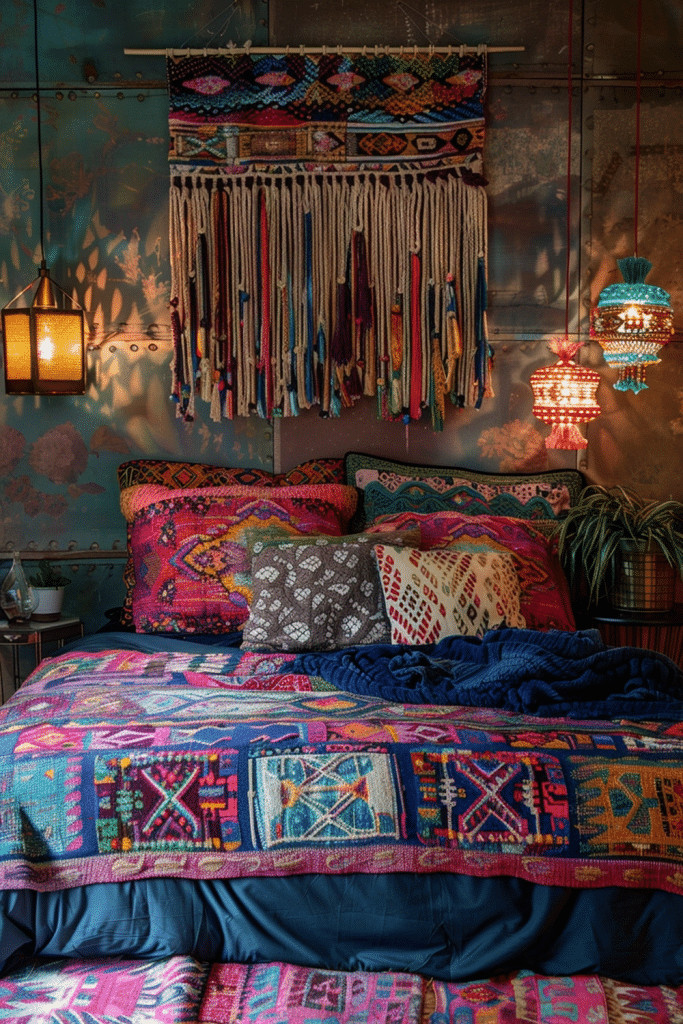 Rich, bohemian textiles, with their intricate patterns and deep, vibrant colors, can add a layer of warmth, intrigue, and well-traveled flair to a moody bedroom. A beautiful, patterned Persian or Turkish rug on the floor, or a hand-woven textile used as a wall hanging, can make the space feel both cozy and incredibly soulful.