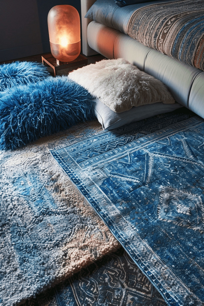 Layering plush, soft rugs on the bedroom floor is a fantastic way to add warmth, texture, and a sense of luxury to your moody retreat. You could place a smaller, faux fur or sheepskin rug on top of a larger, low-pile wool rug. This not only feels incredible underfoot but also enhances the cozy, comfortable, and indulgent feel of the space.