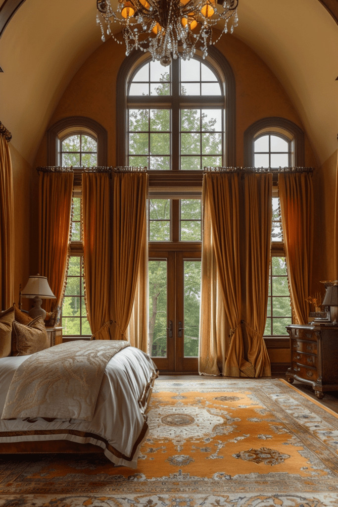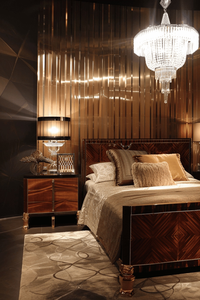 The glamour and sophistication of the Art Deco period are a perfect match for a moody bedroom. Incorporate Art Deco details like bold, geometric patterns, fan-shaped motifs, and luxurious, metallic finishes. These elements can bring a touch of 1920s glamour and refined elegance to your dark and dramatic space.