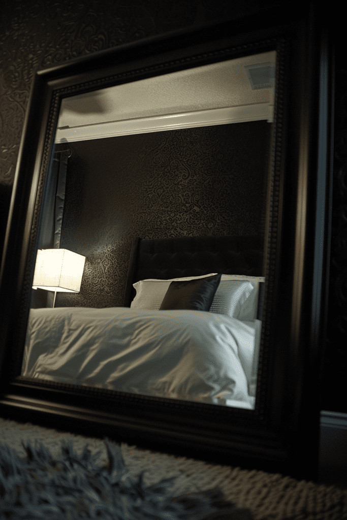 While often used to make a space feel brighter, an oversized mirror can also enhance a moody bedroom. A large mirror with an ornate, dark, or vintage frame can act as a dramatic piece of art. It can reflect the soft, ambient light in the room, creating a beautiful, mysterious glow and adding a sense of depth and glamour to the space.