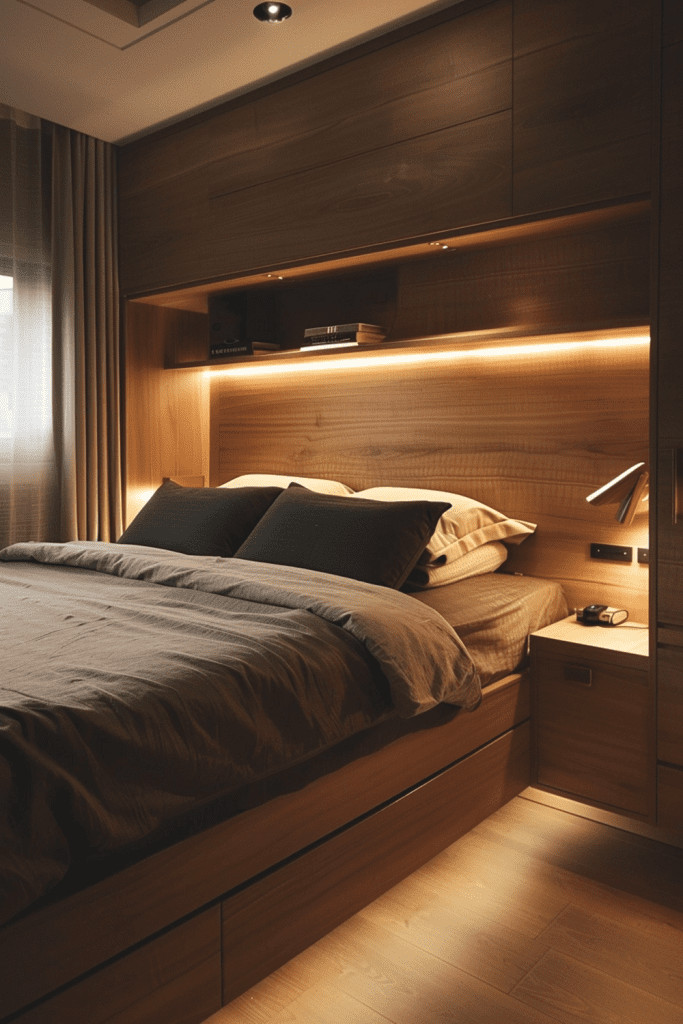 Imagine a bedroom where one entire wall is a floor-to-ceiling library, painted in a deep, moody color like charcoal gray or forest green. The shelves, also painted the same color, are filled with books, creating a rich, textural backdrop. A comfortable, worn leather armchair and a single, warm reading lamp are tucked into a corner of this library wall. This design creates an incredibly cozy, intellectual, and enveloping atmosphere, turning your bedroom into a personal sanctuary for both rest and quiet contemplation.
