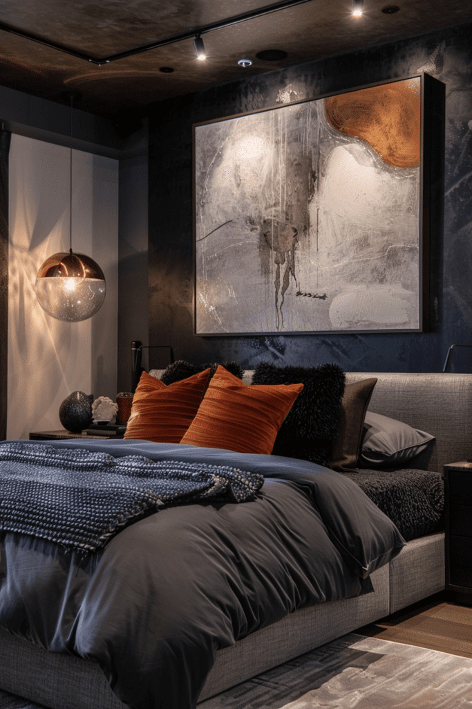 A single, large, and bold piece of art can serve as a powerful focal point in a moody bedroom. The art can set the tone for the entire room with its visual impact and thematic depth. A dramatic, abstract painting with deep colors, a large-scale black and white photograph, or a moody landscape can all enhance the room’s sophisticated and contemplative atmosphere.