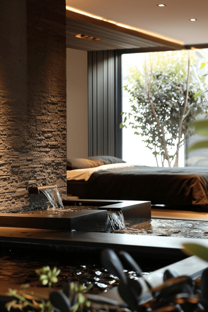 For the ultimate serene, moody sanctuary, consider introducing a small, indoor water feature. The gentle, trickling sound of water can be incredibly calming and meditative. A simple, modern, tabletop fountain made of dark stone can add a soothing, spa-like sound and a beautiful, natural movement to the space, enhancing the tranquil, moody atmosphere.