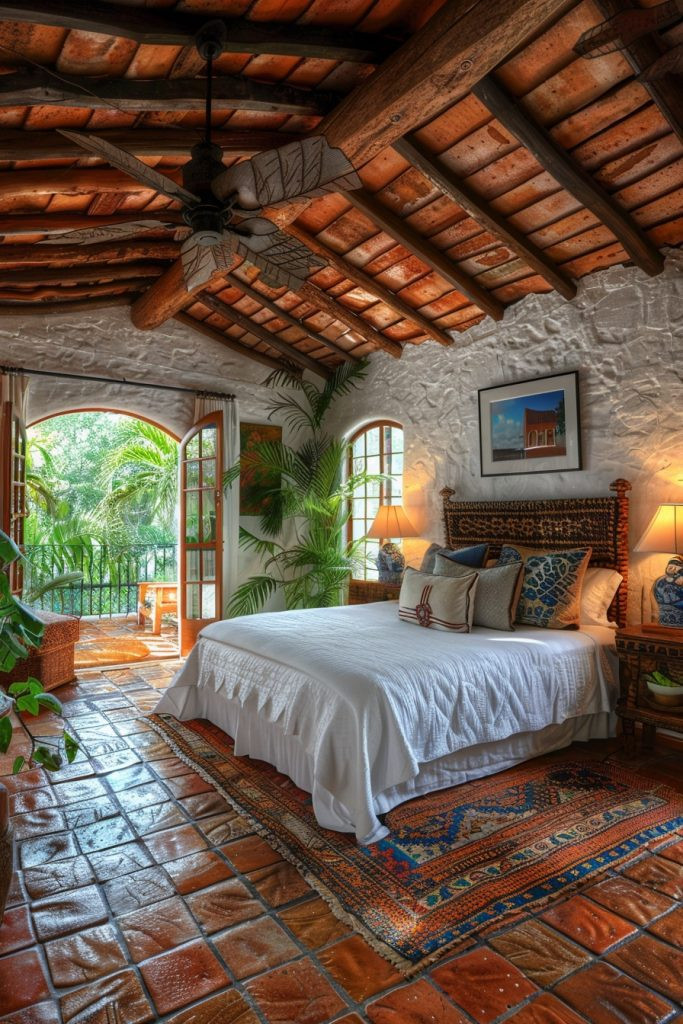 Brighten your space and capture the lively, energetic spirit of Cuba with a room full of bold color and tropical flair. This style fearlessly combines bright colors like turquoise, yellow, and fuchsia with rich, tropical patterns featuring palms and exotic flowers. Incorporate dark wood furniture and perhaps some cultural elements like vintage travel posters or handmade ceramics. This vibrant and energetic decor is ideal for those who love a bedroom that is full of life, music, and personality.