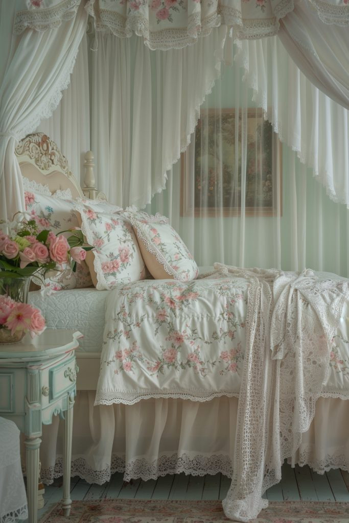 Adorn your bedroom with delicate, romantic touches to create a dreamy summer boudoir. This style uses soft pastel colors, lightweight and intricate fabrics like lace and embroidered cotton, and soft, romantic lighting from shaded lamps or candles. Fresh flowers, particularly roses or peonies, are a must. This theme is perfect for adding a touch of romance and old-world elegance to your summer nights, creating a space that feels both intimate and enchanting.