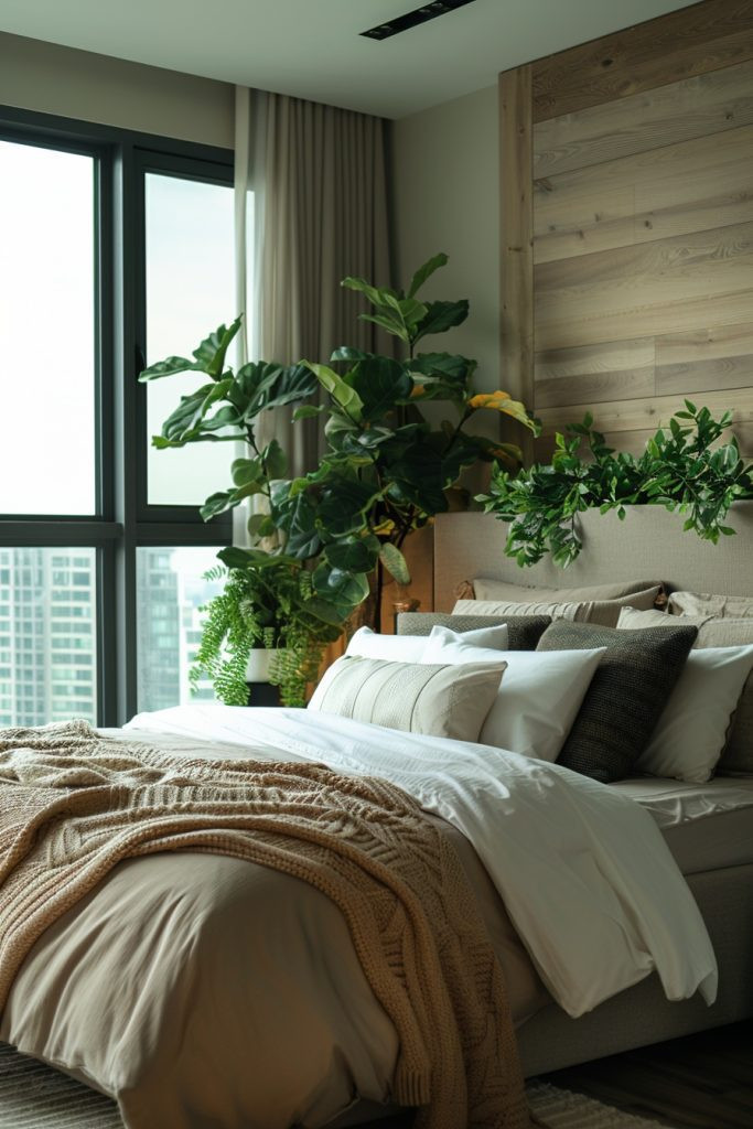 For city dwellers, transform your urban bedroom into a serene and refreshing oasis. This style blends sleek, modern decor with an abundance of lush greenery. The contrast between the clean lines of the furniture and the organic shapes of the plants creates a dynamic and calming effect. Use a variety of plants at different levels—hanging from the ceiling, on shelves, and in large floor pots—to create a true indoor jungle. This setup is the perfect, restorative escape for recharging after long, hot summer days in the city.