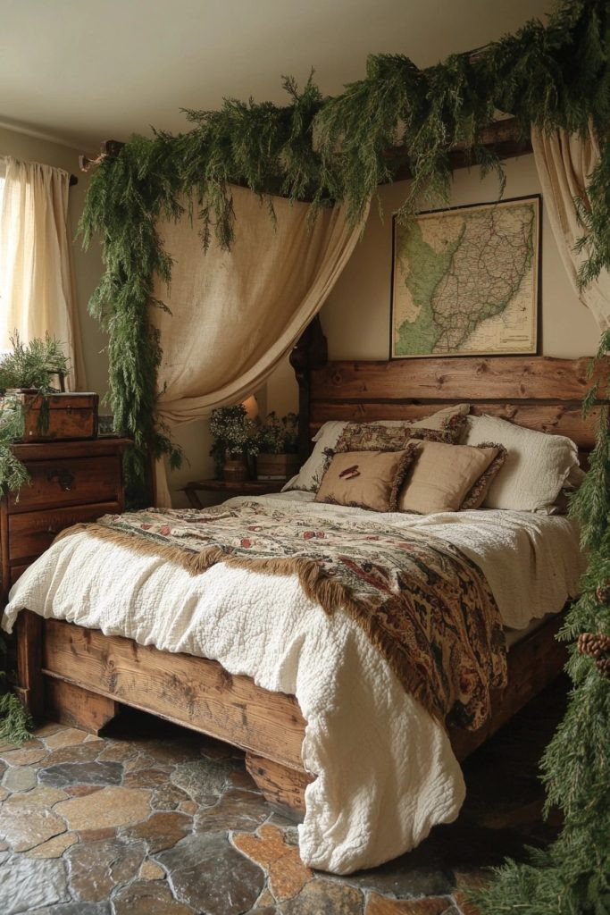 A Woodland Whisper Bedroom uses soft greens, earthy browns, and imagery of woodland creatures or plants to create a serene, nature-inspired rustic bedroom. The use of natural materials such as a real branch used as a curtain rod or garlands of dried leaves as decor keeps the theme integrated and whimsical. Plush area rugs and layered bedding ensure comfort and warmth. This bedroom is a soothing space, ideal for unwinding and reconnecting with the quiet magic of nature.