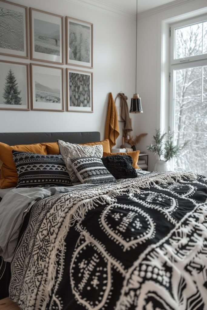 A Monochrome Magic bedroom focuses on a sophisticated black and white color scheme, bringing a sharp, contemporary contrast to the soft, natural textures of bohemian style. This look plays with bold patterns—like geometric prints, stripes, or abstract designs—to add depth and visual interest, keeping the space vibrant yet cohesive. The simple, monochrome palette makes it easy to mix and match different decor elements while maintaining a chic, unified, and modern look.