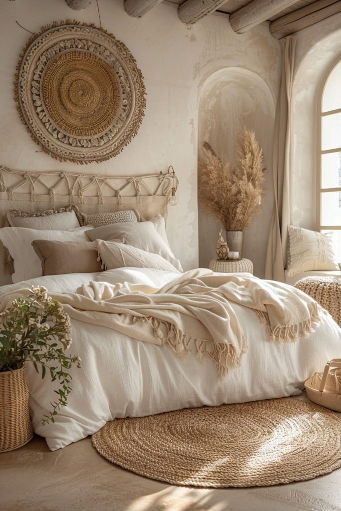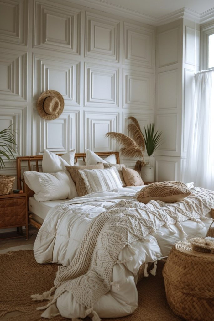 A Neutral Nirvana bedroom uses a calming palette of neutral colors to enhance the sense of peace and tranquility. Soft beiges, gentle grays, creamy whites, and warm taupes dominate the space, providing a clean and serene backdrop for minimalist furniture. The subtle bohemian accents come through in the form of varied textures, natural materials like pampas grass, and handcrafted decor items. This setting is perfect for those who prefer a subdued, deeply relaxing bedroom atmosphere.