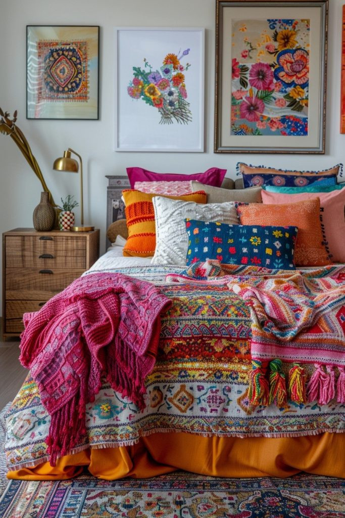Bohemian Brilliance is a style characterized by the joyful use of vibrant colors and dynamic patterns that bring life and energy to a minimalist Scandinavian backdrop. This style is all about expressing individuality and creativity through bold textiles, a gallery wall of eclectic art, and colorful accessories. While the furniture remains simple and functional, the decor is expressive and full of life. It’s ideal for those who want their bedroom to be a lively, happy, and inspiring retreat.