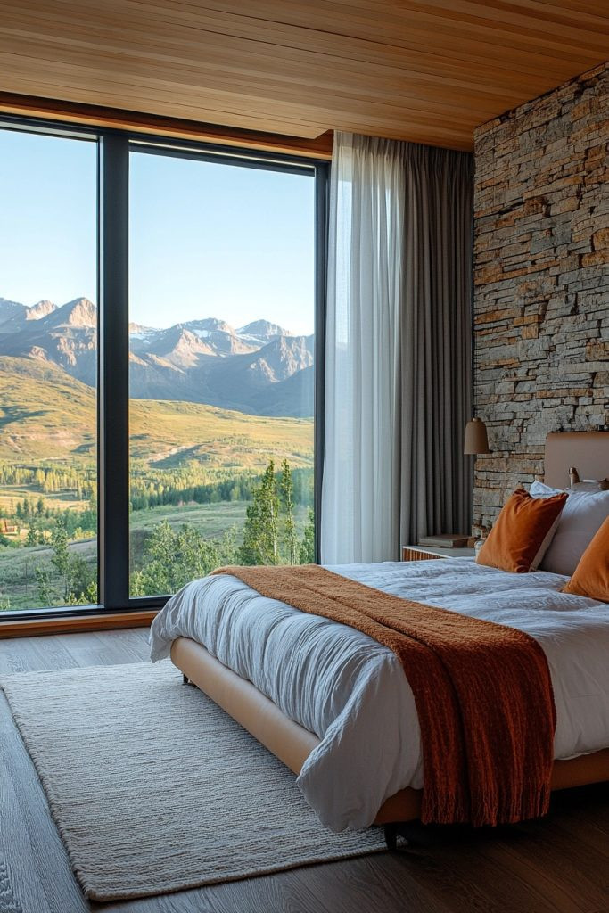 This design is all about the view. The bedroom’s layout and features are strategically planned to maximize a breathtaking mountain vista. A large, perfectly placed window becomes the room’s main focal point, with decor kept subtle and understated to avoid distraction. The color palette is soft and neutral, complementing the natural scenery outside. Minimal furniture ensures the room feels open and that the connection to the majestic exterior remains uninterrupted, perfect for waking up to an inspiring view.