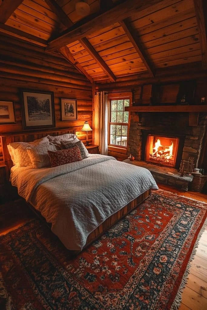 This small cabin interior bedroom blends sophisticated design with rustic elements, creating an elegant yet cozy space. Luxurious textiles and high-quality materials like silk and velvet are paired with rustic wood and stone, bridging the gap between elegance and ruggedness. The careful selection of decor keeps the room feeling refined and plush, while still fitting the cabin theme. This bedroom is ideal for those who appreciate a more sophisticated approach to rustic design.